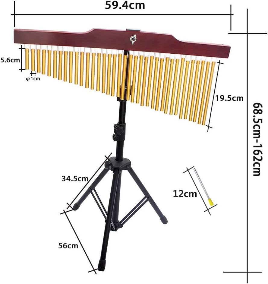 Golden Bar Chimes With 36 Solid Aluminum Alloy Bars Producing Beautiful Sound Well Crafted With A Nicely Finished Solid Wood Base Can Be Played By Your Fingers Or The Included Metal Striker Comes With An Adjustable Tripod Stand To Hold It Up For Easy