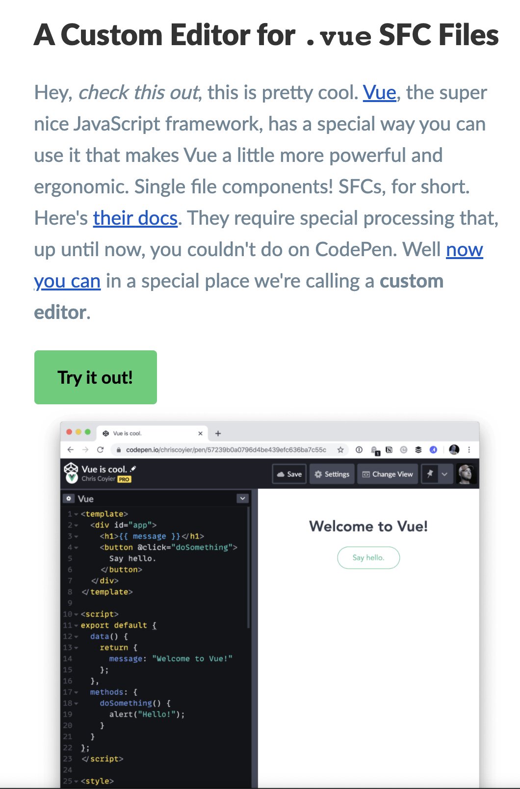 Sarah Drasner On Twitter Codepen Got Vue Single File Component Sfc Support If You Don T Know What They Are In Vue We Allow You To Work With Template Script And Scoped Styles All Within One Component It S Very Nice Developer Experience Https T